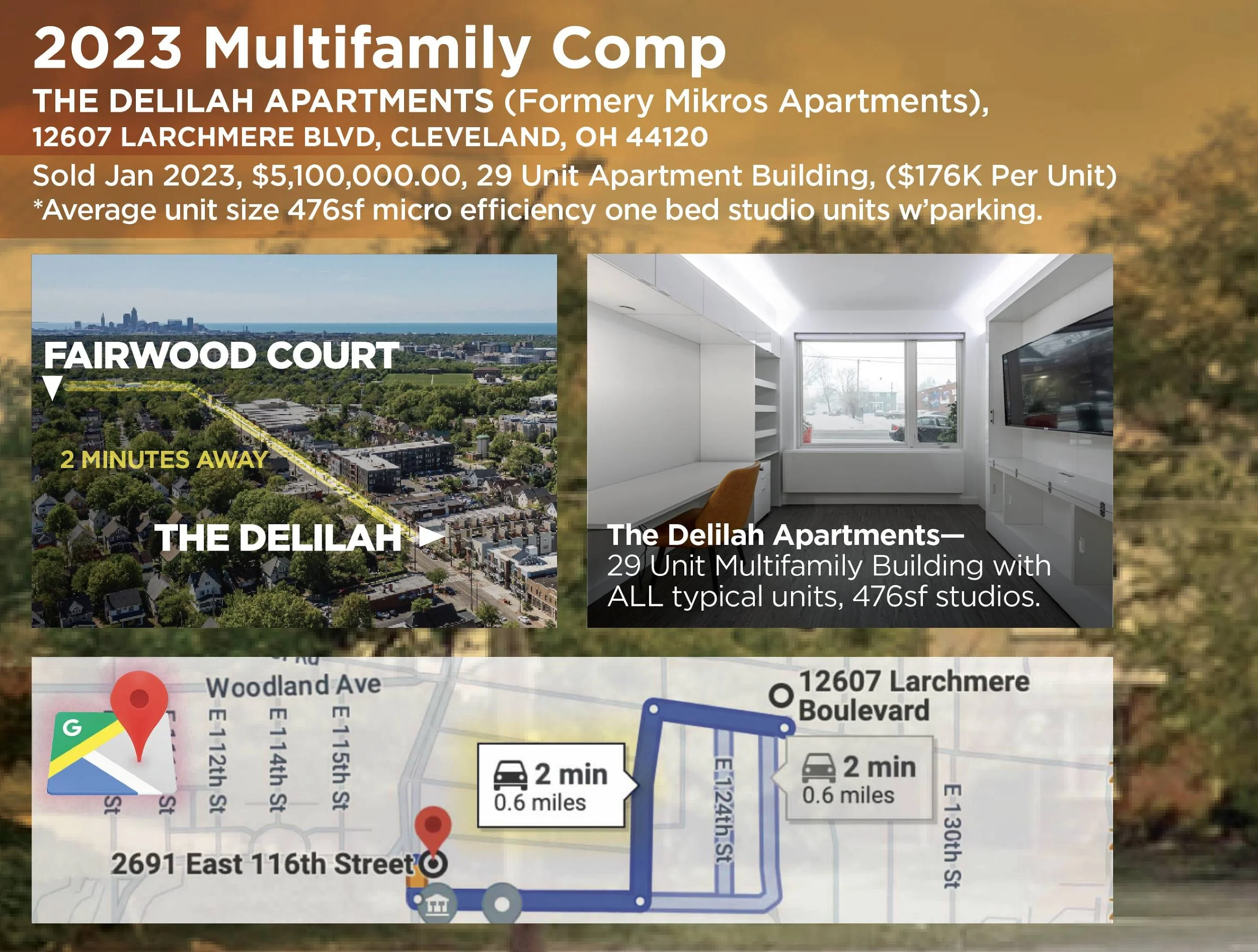A 29-unit micro-efficiency apartment building just two minutes away sold for $5.1M ($176K per unit) in January 2023, setting a precedent for high-value sales in the neighborhood.