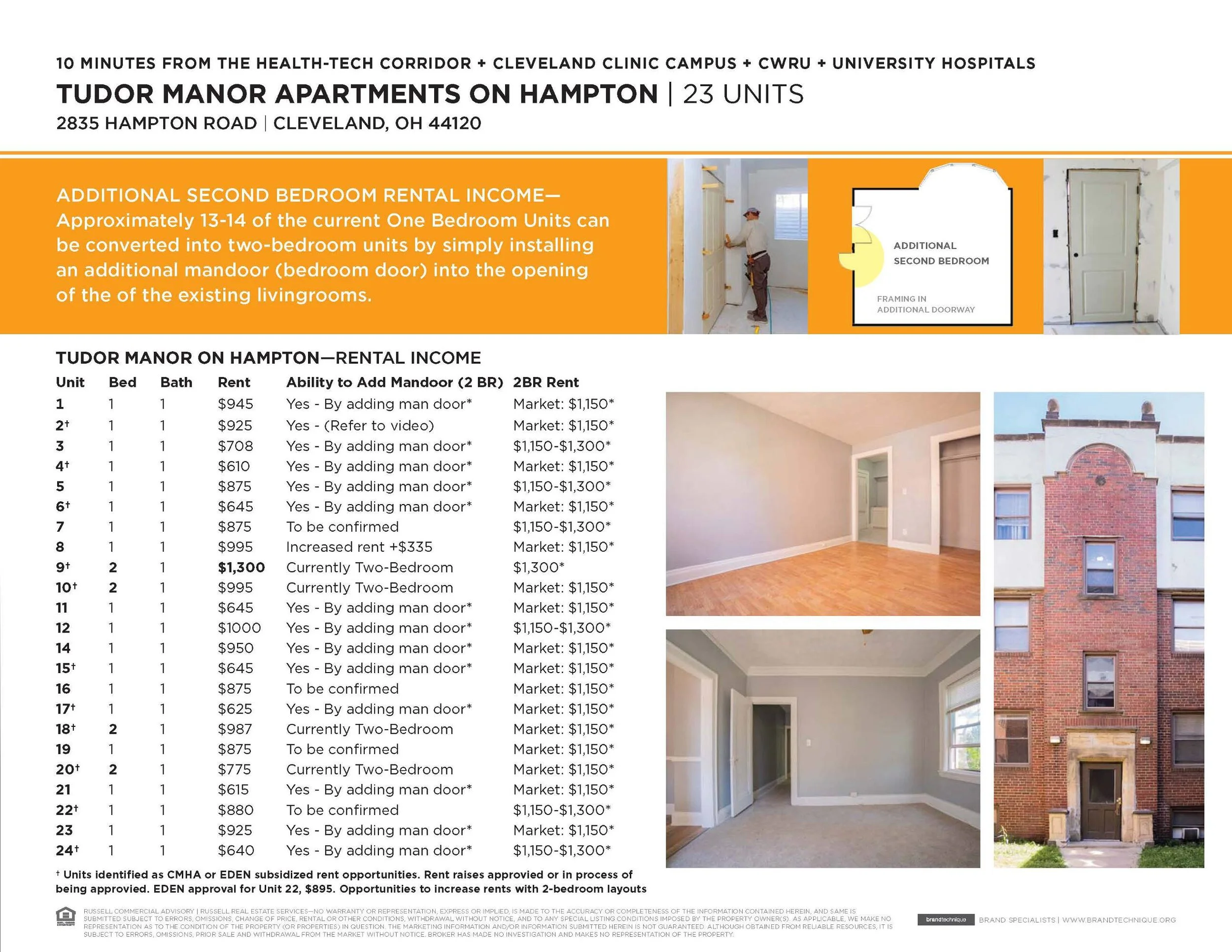 13–14 units can be converted from 1BR to 2BR with minimal work (adding a “man door”), unlocking 25–35% rent growth and broader tenant appeal.